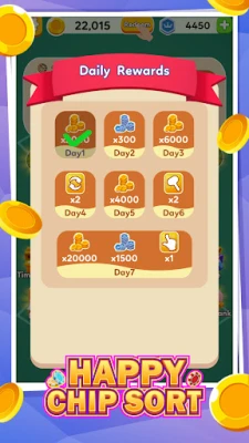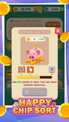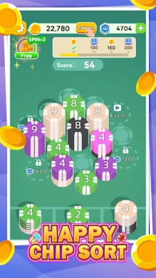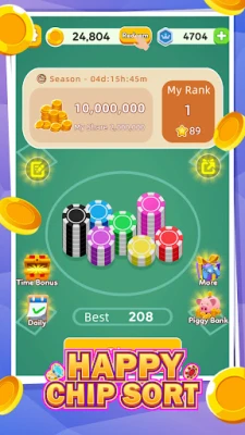 "Happy Chips Sort" is a colorful and novel puzzle game. Drag chips of different colors onto the board and stack them strategically. When chips of the same color reach a specified height, they will trigger elimination, bringing you a series of scores and satisfaction.